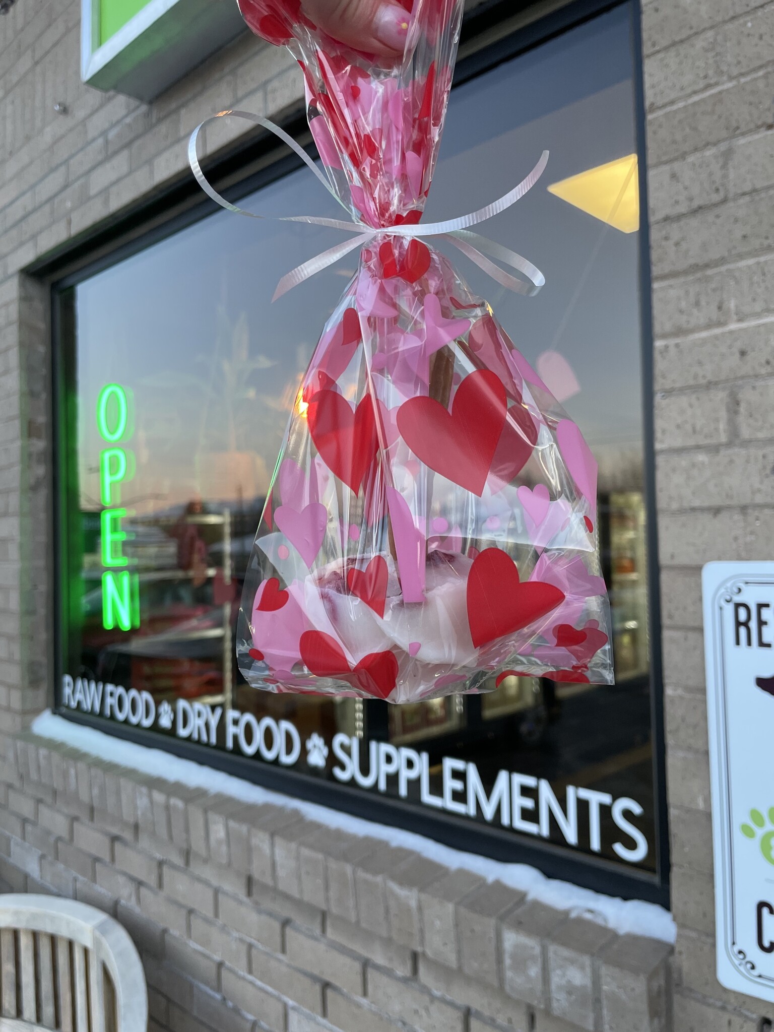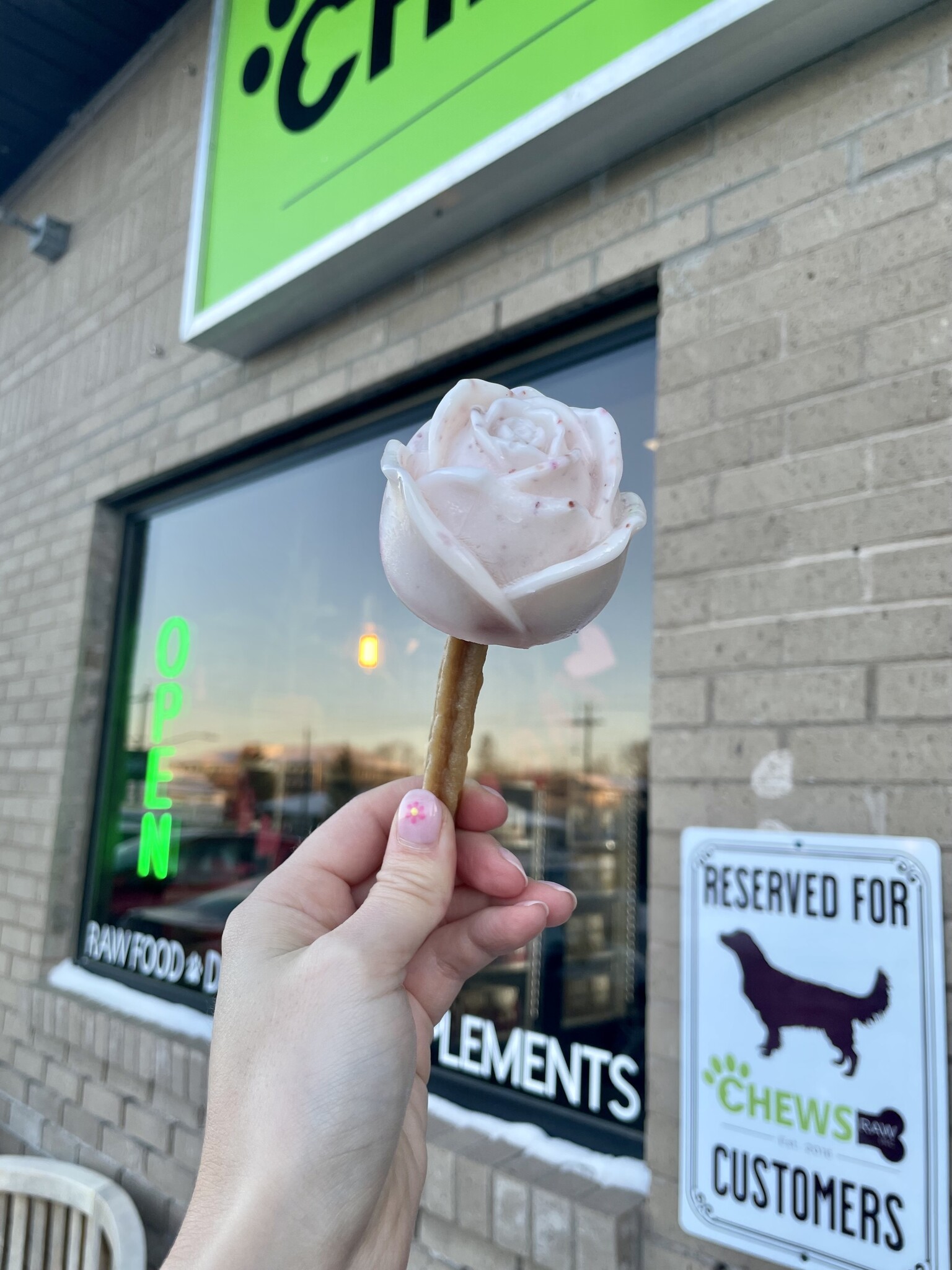 This year's rose pupsicles are made with Crosswind Farms Cranberry Goat Milk, freeze dried strawberries & raspberries, and a whimzee veggie chew for the stem.