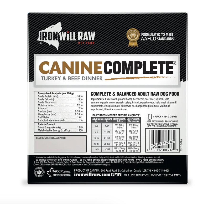 Turkey (with ground bone), beef heart, beef liver, spinach, kale, summer squash, winter squash, celery, fish oil, squash seeds, kelp meal, vitamin E supplement, zinc proteinate, sunflower oil, manganese proteinate, vitamin D supplement, thiamine mononitrate.