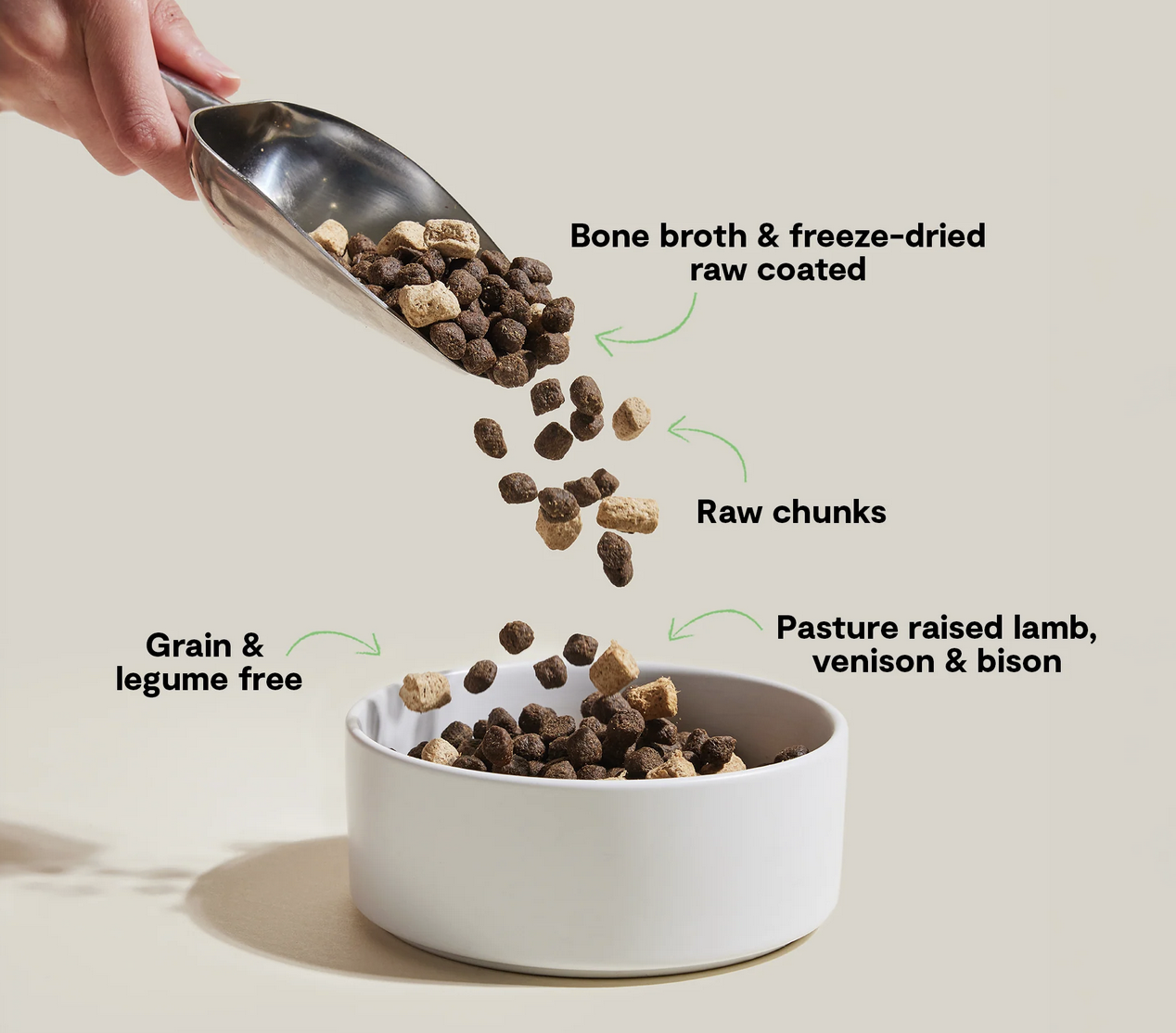 ReWild their diet with this multi-animal protein blend of pasture-raised lamb, venison and bison, crafted without poultry and covered in a beef bone broth and freeze dried raw coating. Bonus freeze dried raw chunks provide a protein-packed boost, while superfoods like sweet potato and pumpkin ensure a complete and balanced nutrition.